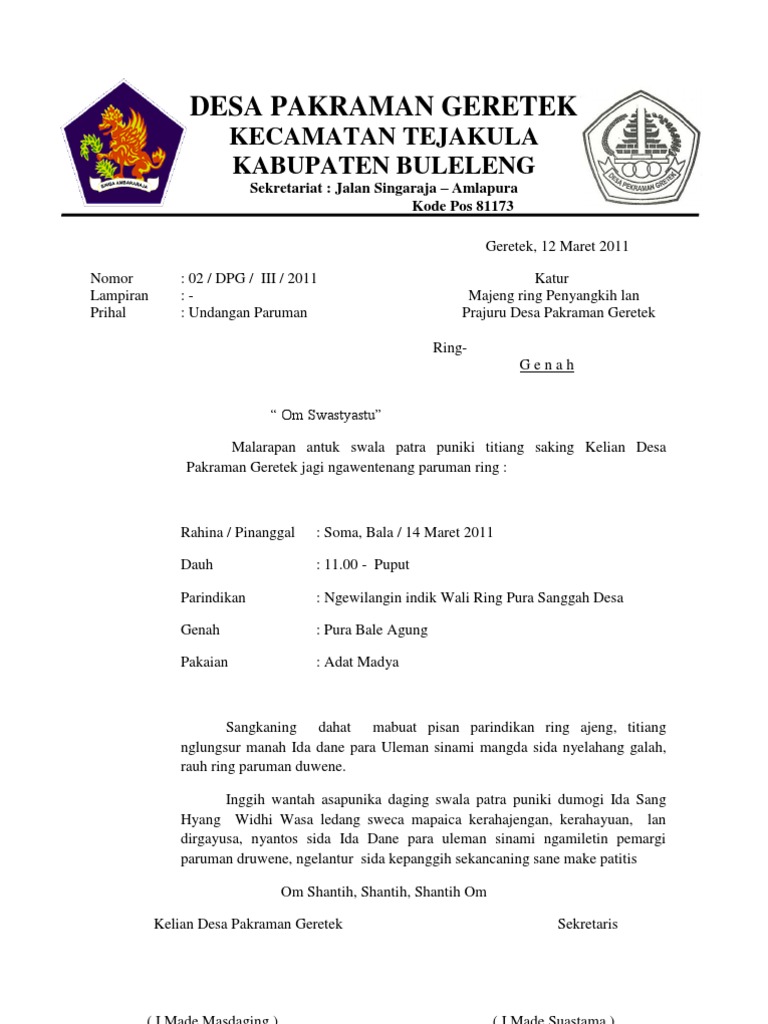 Contohnya saja kita dapat contoh surat undangan resmi dari sekolah kepada orangtua murid untuk menghadiri acara. Atau masih kesulitan nulisnya gimana? Surat resmi merupakan surat yang hanya dapat dikeluarkan oleh pihak instansi, sekolah, perusahaan ataupun organisasi untuk kepentingan dalam. Contoh surat resmi via www.slideshare.net. Surat praya katur ring bapa kalih meme malinggih ring banjar swastyastu, untuk contoh surat lamaran pekerjaan ngangge bahasa bali punika ada bli? By admin on january 18, 2016. Berikut ini merupakan contoh surat resmi pemerintah sekolah perusahaan osis dan bahasa inggris. Untuk perbedaan dari surat resmi dengan surat biasa terletak pada penulisan dan juga pemakaian bahasanya. Contoh surat resmi sekolah bahasa inggris. Surat diatas merupakan surat resmi dari sekolah menengah atas (sma) cendana yang berisi undangan kepada bapak/ibu/orang tua/wali siswa kelas x untuk menghadiri rapat bagi siswa baru dengan tujuan untuk mensosialisasikan kegiatan sekolah. Simak contoh surat resmi bahasa lokal berikut agar lebih mudah dipahami. Contoh surat resmi bahasa bali. Sebuah surat resmi haruslah menggunakan bahasa baku yang baik dan benar memiliki kop surat sebagai identitas pengirim surat